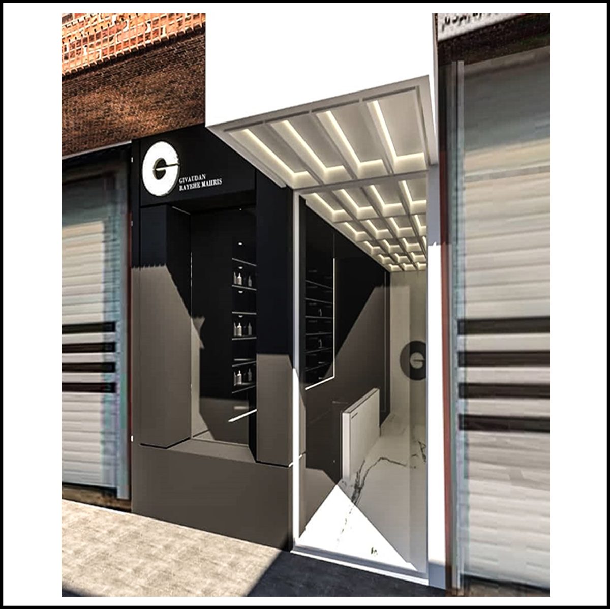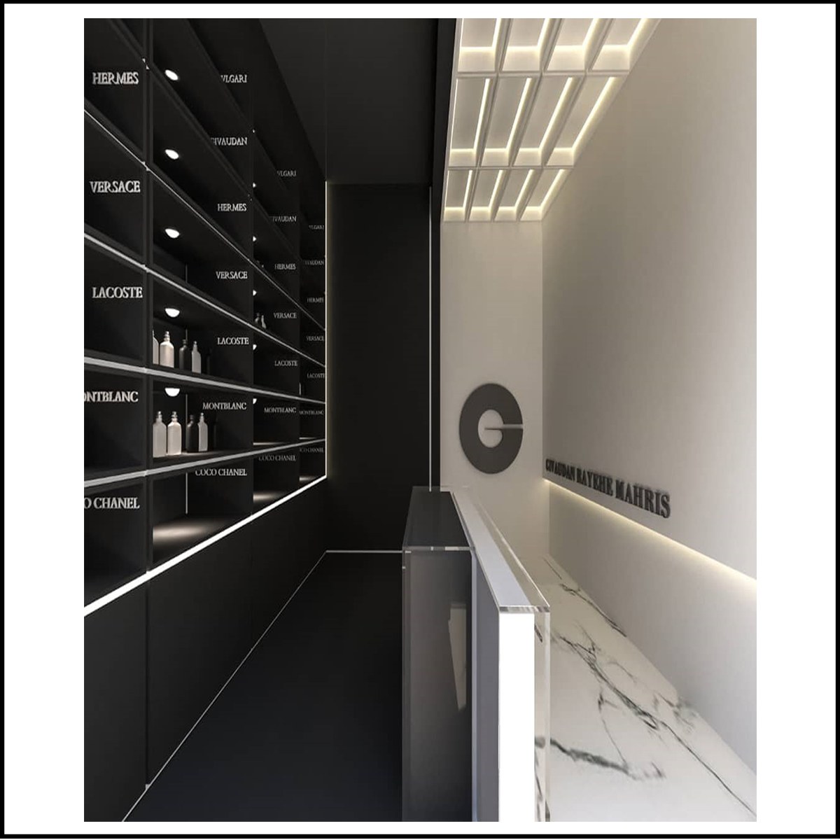 با توجه به متراژ محدود فروشگاه عطر واقع در ناصر خسرو به گونه ای طراحی شد که فضا کاملا مینیمال و خلوت دیده شود و از ترکیب دو رنگ مشکی و سفید و استفاده شده که بدین ترتیب نما و فضای داخلی در بافت قدیمی منطقه خود را نشان می دهد .